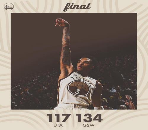 库里抢断马尔卡宁,希尔德失误,贝利反击暴扣。乔治上篮得分,佩顿、贝利对轰远投。马尔卡宁2罚1中,穆迪暴扣。乔治命中2+0,希尔德回敬三分球,距离终场不足4分钟之际,勇士领先24分锁定胜局。科尔换下库里等首发,两队开始在场上练兵,时间逐渐走完。最终,勇士以134比117完胜爵士。