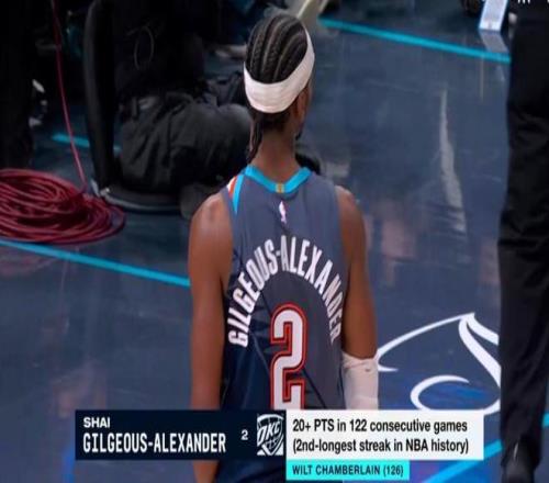 亚历山大已连续122场砍下20+,距离NBA历史纪录张伯伦的126场仅差4场。